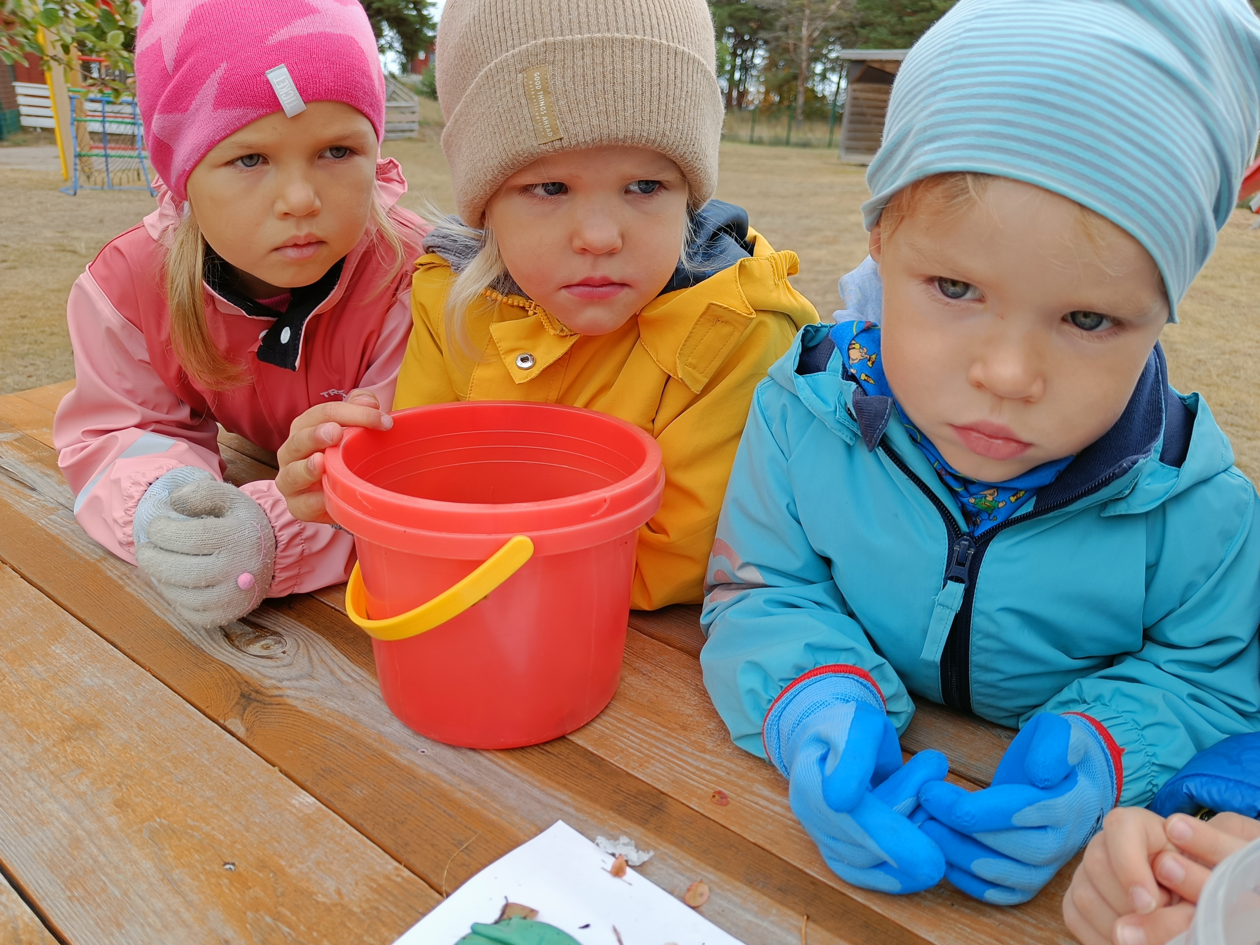 Rühmas tegime pikaaegse katse: panime ämbrisse vette erinevat prügi ja imiteerides merepõhja ja laineid, hõõrusime neid kivide ja liivaga. Nüüd on see ämber aiamaal ootamas ja me jälgime kuidas erinevad materjalid aja jooksul vees lagunevad.