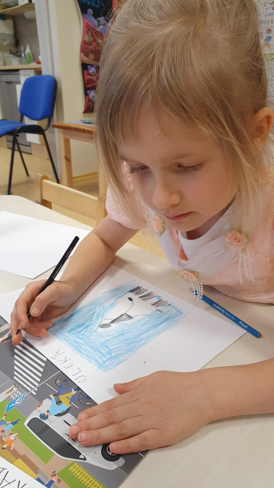 Lapsed joonistasid ülekäiguraja märke, mille me hiljem lamineerime ning kasutame õuesõppes liikluskasvatuse tegevustes.